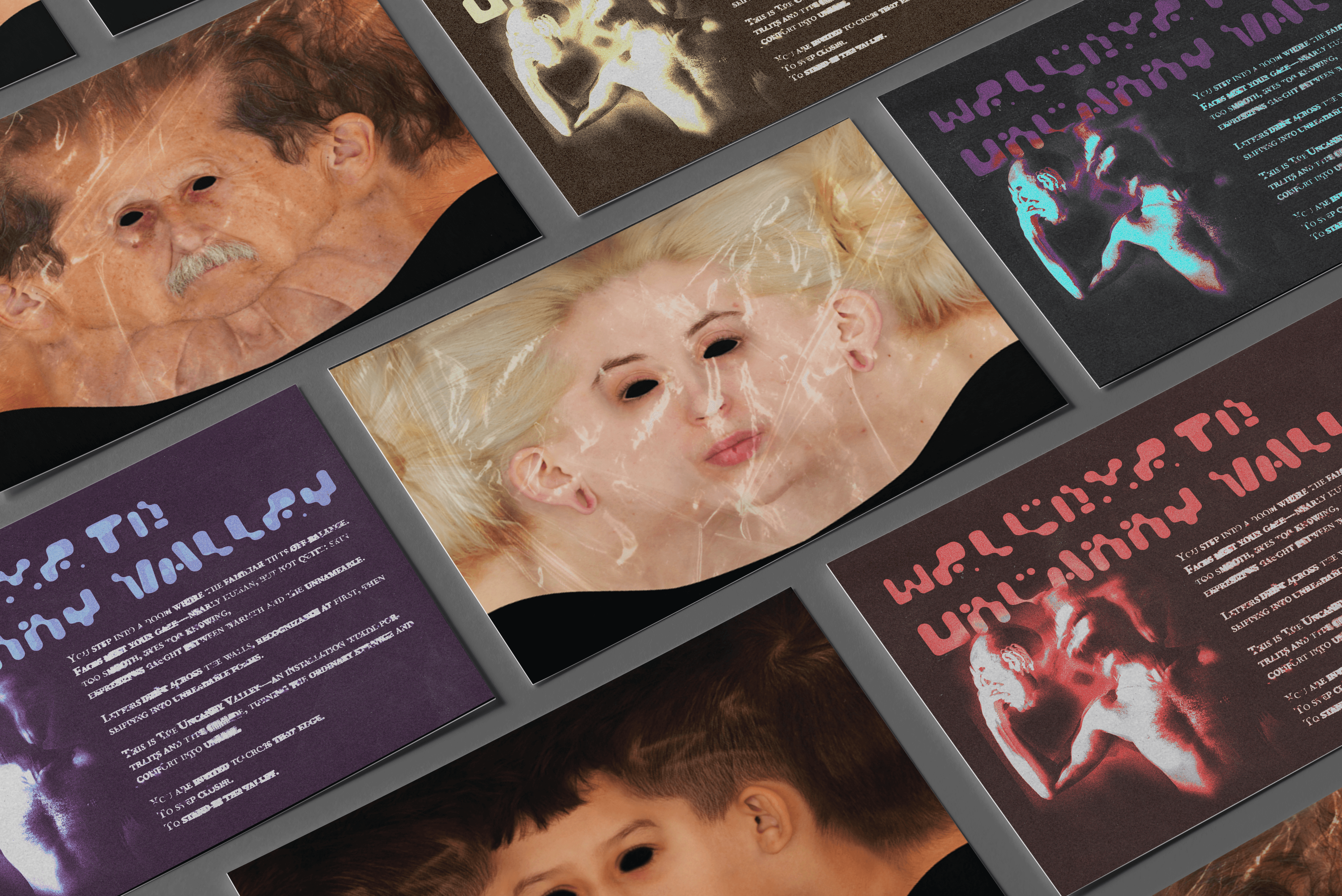 Presented as an immersive spatial installation, the project surrounded viewers with these portraits and type treatments, while invitation cards and posters extended the experience beyond the space, serving as tactile and graphic entry points into the theme. Together, these elements invited audiences to confront the uneasy boundary between recognition and discomfort.